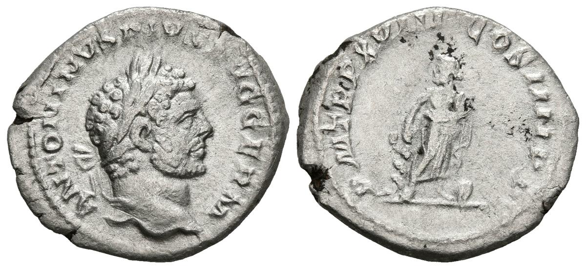 CARACALLA. Denario forrado. (Ar-Ae. 2,27g/20mm). 215 d.C. Roma. (RIC 251). Anv: Busto laureado de Caracalla a derecha, alrededor leyenda: ANTONINVS PIVS AVG GERM. Rev: Aesculapius estante a izquierda con una vara en la que se enrolla una serpiente, detrás globo, alrededor leyenda: P M TR P XVIII COS IIII P P. MBC.