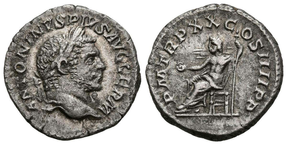 CARACALLA. Denario. (Ar. 3,36g/18mm). 217 d.C. Roma. (RIC 291b). Anv: Busto laureado de Caracalla a derecha, alrededor leyenda: ANTONINVS PIVS AVG GERM. Rev: Júpiter sentado a izquierda portando pátera y cetro, alrededor leyenda: P M TR P XX COS IIII P P. MBC+.