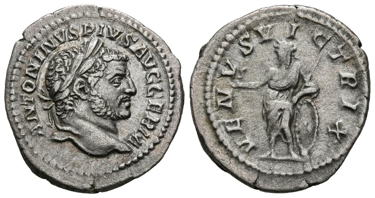 CARACALLA. Denario. (Ar. 3,16g/21mm). 213-217 d.C. Roma. (RIC 311b). Anv: Busto laureado de Caracalla a derecha, alrededor leyenda: ANTONINVS PIVS AVG GERM. Rev: Venus estante a izquierda sosteniendo Victoria y escudo, alrededor leyenda: VENVS VICTRIX. MBC.