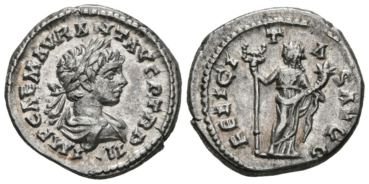 CARACALLA. Denario. (Ar. 3,47g/19mm). 199 d.C. Laodicea. (RIC 399b). Anv: Busto laureado y drapeado de Caracalla a derecha, alrededor leyenda: IMP CAE M AVR ANT AVG P TR P II. Rev: Felicitas estante a izquierda portando caduceo y cornucopia, alrededor leyenda: FELICITAS AVGG. EBC-. Escaso.