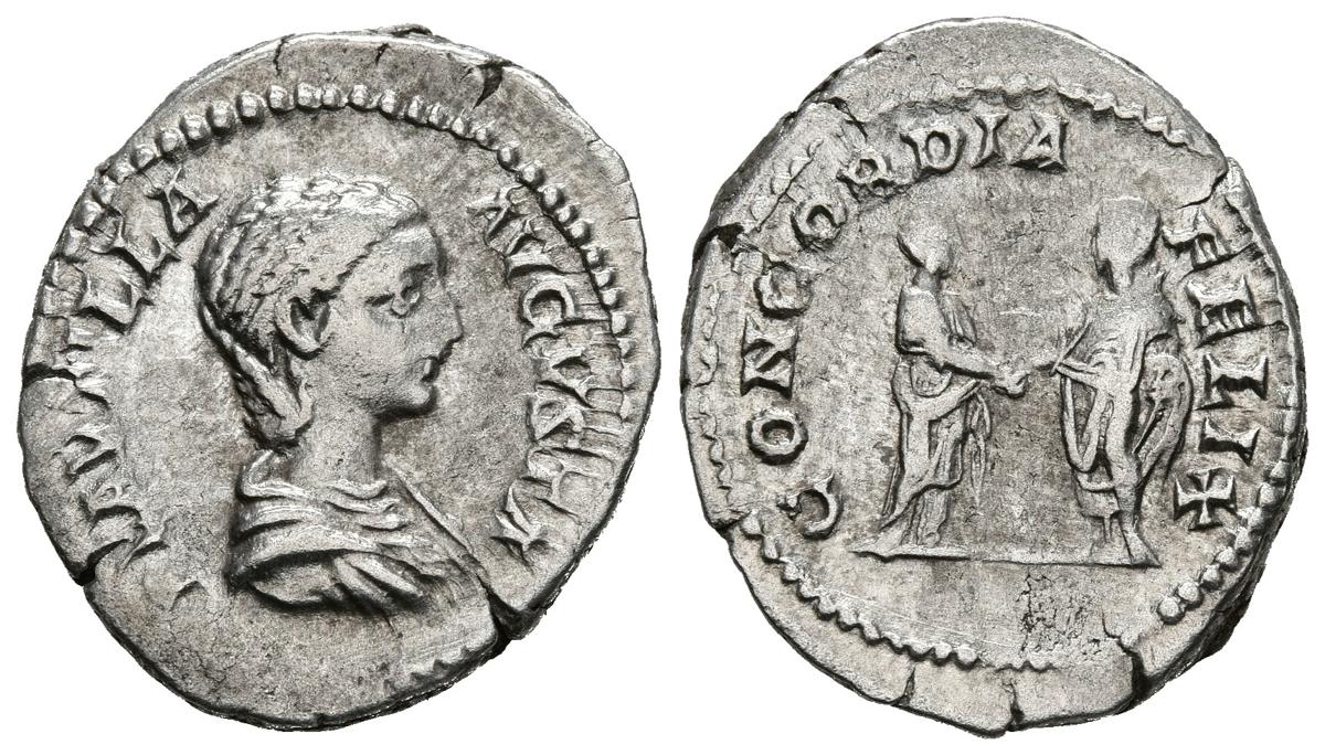 PLAUTILLA. Denario. (Ar. 3,30g/18mm). 202 d.C. Roma. (RIC 363a). Anv: Busto laureado de Plautilla a derecha, alrededor leyenda: PLAVTILLA AVGVSTA. Rev: Concordia estante a izquierda portando patera y cetro, alrededor leyenda: CONCORDIA AVGG. MBC+.