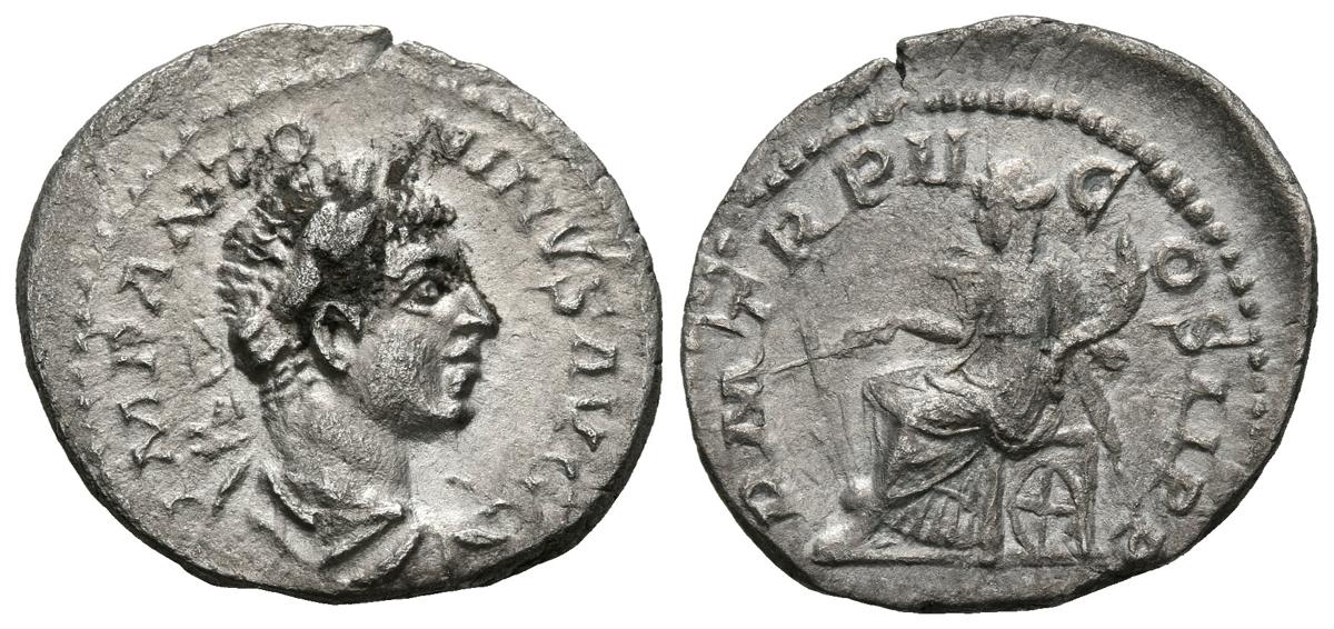 HELIOGABALO. Denario. (Ar. 2,20g/20mm). 219 d.C. Roma. (RIC 19). Anv: Busto laureado y drapeado de Heliogábalo a derecha, alrededor leyenda: IMP ANTONINVS AVG. Rev: Fortuna sentada a izquierda portando timón u cornucopia, alrededor leyenda: P M TR P II COS II P P. MBC.
