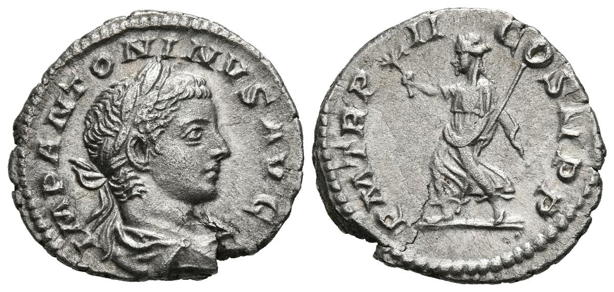 HELIOGABALO. Denario. (Ar. 2,51g/19mm). 219 d.C. Roma. (RIC 21). Anv: Busto laureaod y drapeado de Heliogábalo a derecha, alrededor leyenda: IMP ANTONINVS AVG. Rev: Pax avanzando a izquierda portando rama y cetro, alrededor leyenda: P M TR P II COS II P P. MBC+.