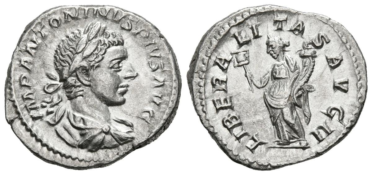 HELIOGABALO. Denario. (Ar. 3,23g/20mm). 219-220 d.C. Roma. (RIC 100). Anv: Busto laureado y drapeado de Heliogábalo a derecha, alrededor leyenda: IMP ANTONINVS PIVS AVG. Rev: Liberalitas estante a izquierda portando ábaco y cornucopia, alrededor leyenda: LIBERALITAS AVG II. EBC.