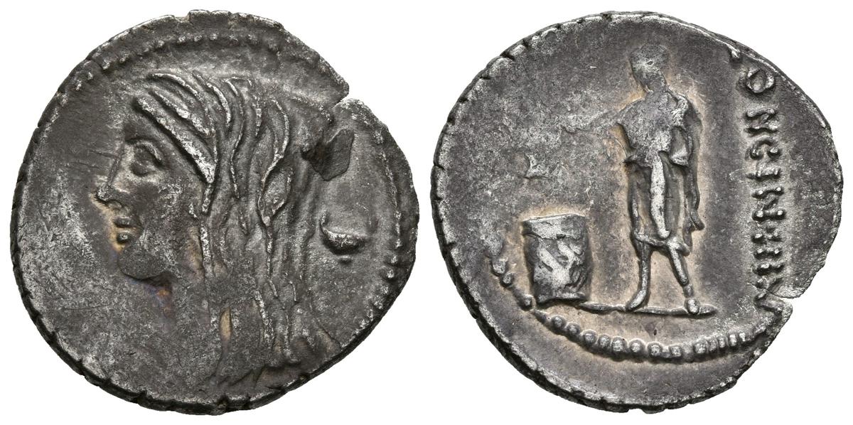 GENS CASSIA. Denario. (Ar. 3,53g/20mm). 55 a.C. Roma. (FFC 561; Crawford 413/1). Anv: Busto velado de Vesta a izquierda, detrás copa. Rev: Ciudadano romano votando a izquierda, detrás leyenda: LONGIN IIIV. MBC+. Vano de acuñación.