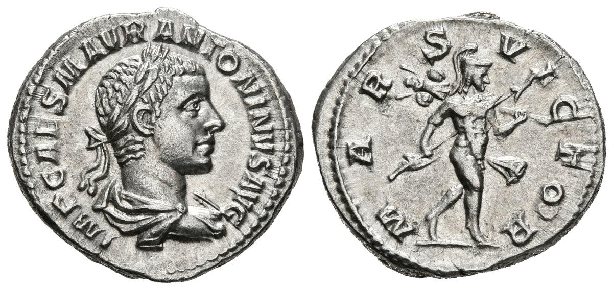 HELIOGABALO. Denario. (Ar. 3,35g/20mm). 218-222 d.C. Roma. (RIC 121). Anv: Busto laureado y drapeado de Heliogábalo a derecha, alrededor leyenda: IMP CAES ANTONINVS AVG. Rev: Marte avanzando a derecha, portando cetro y trofeo, alrededor leyenda: MARS VLTOR. EBC.
