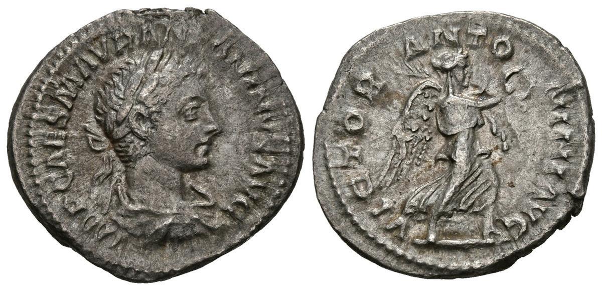 HELIOGABALO. Denario. (Ar. 2,66g/20mm). 218-219 d.C. Roma. (RIC 219). Anv: Busto laureado y drapeado de Heliogábalo a derecha, alrededor leyenda: IMP CAES ANTONINVS AVG. Rev: Victoria avanzando a derecha portando corona de laurel, alrededor leyenda: VICTOR ANTONINI AVG. MBC.