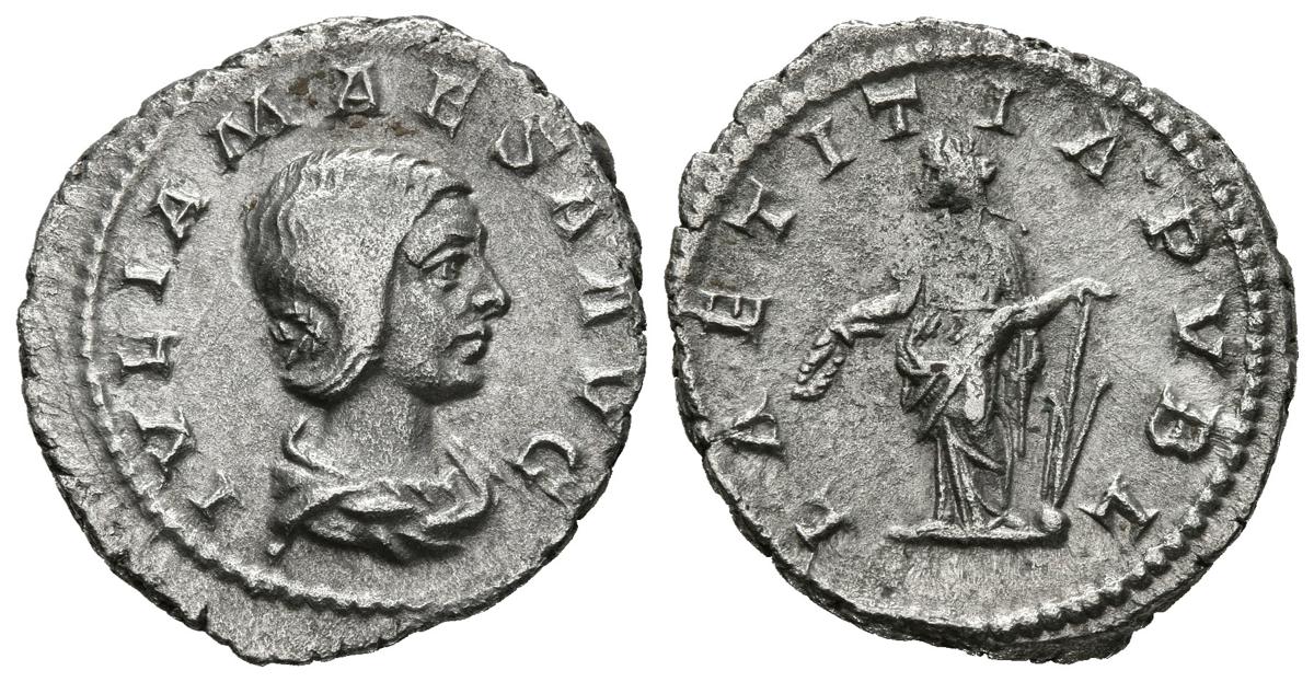 JULIA MAESA. Denario. (Ar. 2,87g/20mm). 218-220 d.C. Roma. (RIC 261). Anv: Busto drapeado de Julia Maesa a derecha, alrededor leyenda: IVLIA MAESA AVG. Rev: Laetitia estante a izquierda portando corona de laurel y timón, alrededor leyenda: LAETITIA AVG. MBC.