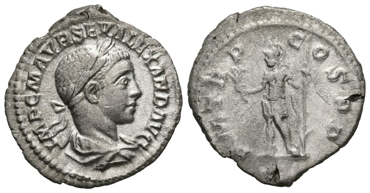 ALEJANDRO SEVERO. Denario. (Ar. 2,60g/19mm). 223 d.C. Roma. (RIC 7). Anv: Busto laureado y drapeado de Alejandro Severo a derecha, alrededor leyenda: IMP C M AVR SEV ALEXAND AVG. Rev: Marte estante a izquierda portando rama y lanza, alrededor leyenda: P M TR P COS P P. MBC-.