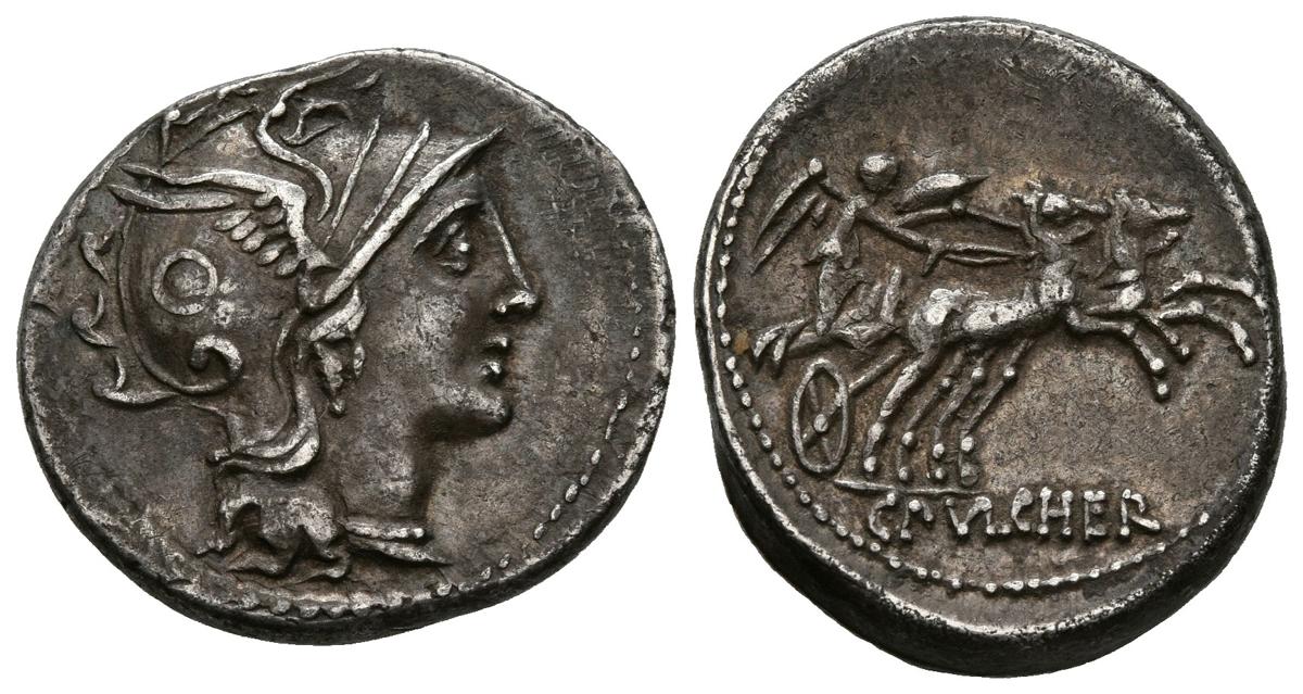 GENS CLAUDIA. Denario. (Ar. 4,06g/19mm). 110-109 d.C. Roma. (FFC 565; Crawford 300/1). Anv: Cabeza de Roma a derecha. Rev: Victoria en biga a derecha, en el exego: C PVLCHER. MBC+. Bonita pátina.