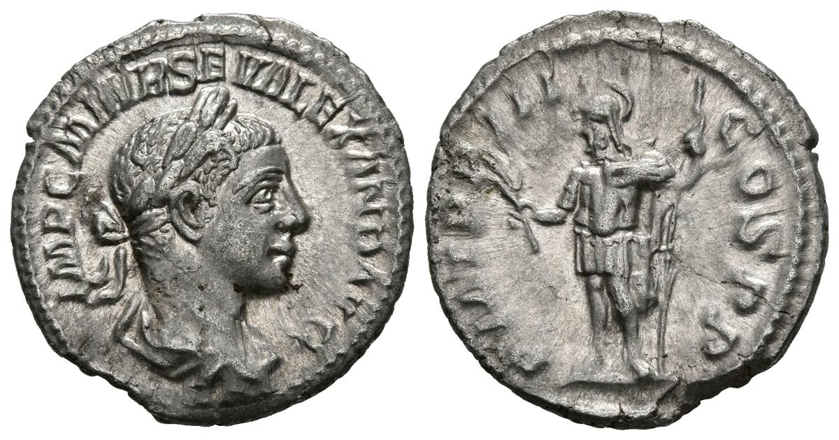 ALEJANDRO SEVERO. Denario. (Ar. 2,43g/19mm). 224 d.C. (RIC 37). Anv: Busto laureado y drapeado de Alejandro Severo a derecha, alrededor leyenda: IMP C M AVR SEV ALEXAND AVG. Rev: Marte estante a izquierda portando rama y lanza, alrededor leyenda: P M TR P III COS P P. MBC+.