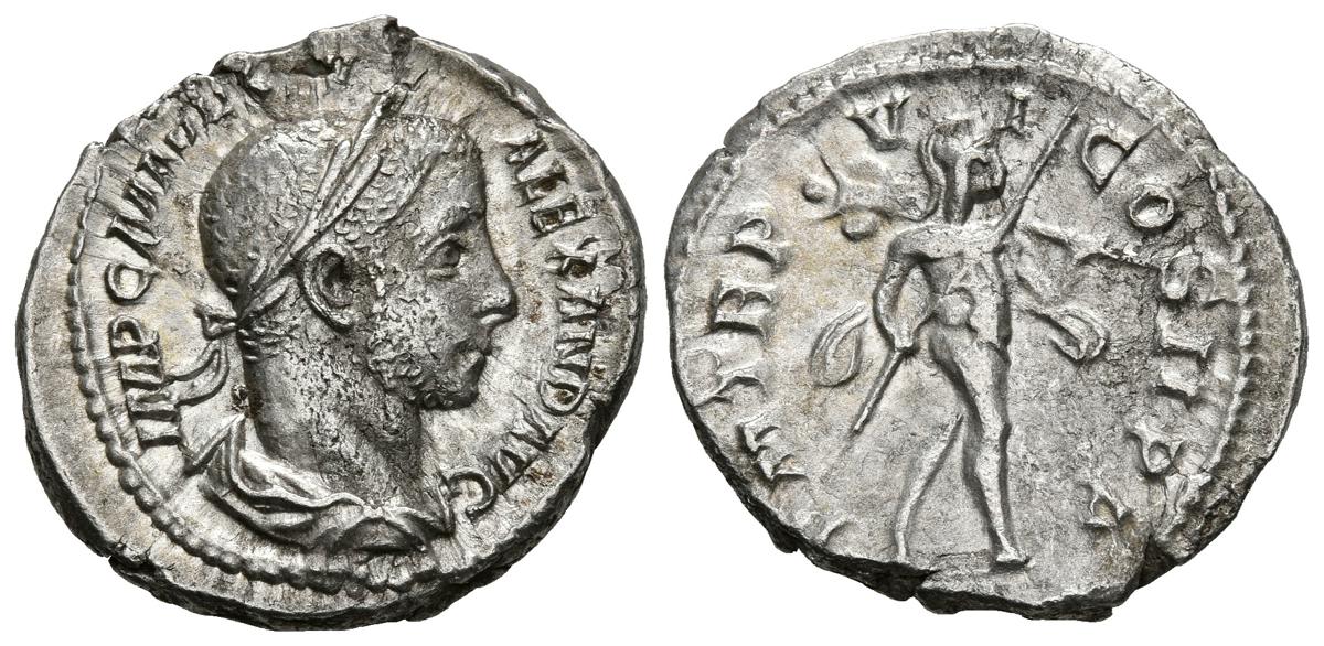 ALEJANDRO SEVERO. Denario. (Ar. 3,02g/20mm). 228 d.C. Roma. (RIC 61). Anv: Busto laureado y drapeado de Alejandro Severo a derecha, alrededor leyenda: IMP C M AVR SEV ALEXAND AVG. Rev: Marte avanzando a derecha con cetro y trofeo, alrededor leyenda: P M TR P VI COS II P P. MBC+.
