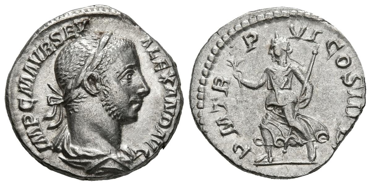 ALEJANDRO SEVERO. Denario. (Ar. 3,02g/18mm). 227 d.C. Roma. (RIC 67). Anv: Busto laureado y drapeado de Alejandro Severo a derecha, alrededor leyenda: IMP C M AVR SEV ALEXAND AVG. Rev: Pax avanzando a izquierda portando rama y cetro, alrededor leyenda: P M TR P VI COS II P P. EBC-.