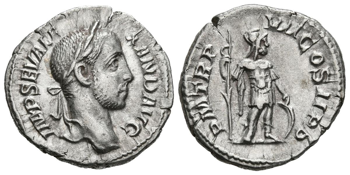ALEJANDRO SEVERO. Denario. (Ar. 3,09g/19mm). 222 d.C. Roma. (RIC 83). Anv: Busto laureado de Alejandro Severo a derecha, alrededor leyenda: IMP SEV ALEXAND AVG. Rev: Marte estante a derecha portando lanza y escudo, alrededor leyenda: P M TR P VI COS II P P. MBC+.