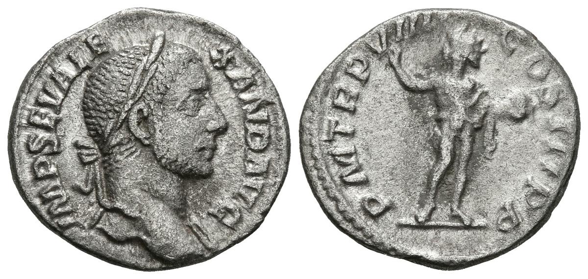 ALEJANDRO SEVERO. Denario. (Ar. 2,38g/18mm). 230 d.C. Roma. (RIC 101). Anv: Busto laureado de Alejandro Severo a derecha alrededor: IMP SEV ALEXAND AVG. Rev: Sol radiado estante a izquierda alzando mano y portando globo, alrededor leyenda: P M TR P VIIII COS II P P. MBC.