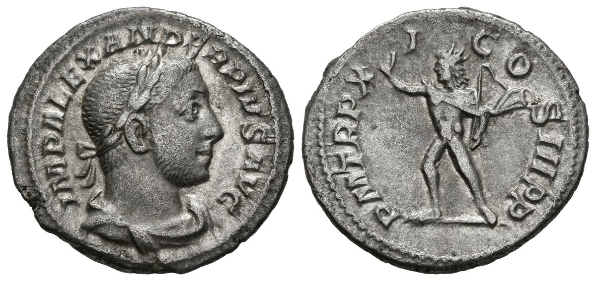 ALEJANDRO SEVERO. Denario. (Ar. 2,99g/20mm). 232 d.C. Roma. (RIC 114). Anv: Busto laureado y drapeado de Alejandro Severo a derecha, alrededor leyenda: IMP ALEXANDER PIVS AVG. Rev: Sol radiado avanzando a izquierda alzando mano y portando látifo, alrededor leyenda: P M TR P XI COS III P P. MBC+.