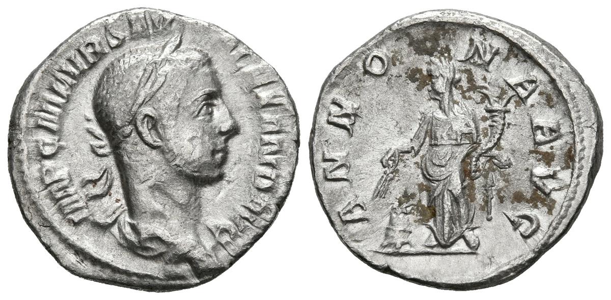 ALEJANDRO SEVERO. Denario. (Ar. 2,50g/18mm). 228 d.C. Roma. (RIC 135). Anv: Busto laureado y drapeado de Alejandro Severo a derecha, alrededor leyenda: IMP C M AVR AEV ALEXAND AVG. Rev: Annona estante a izquierda con espigas encima de modio y cornucopia, alrededor leyenda: ANNONA AVG. MBC.