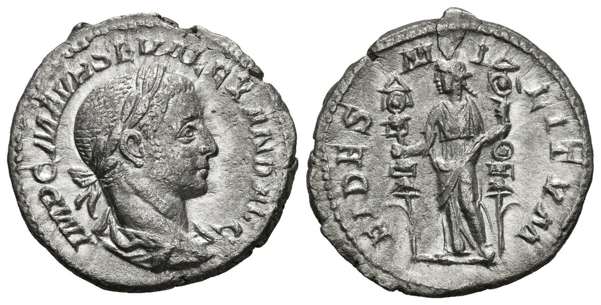 ALEJANDRO SEVERO. Denario. (Ar. 2,68g/19mm). 225 d.C. Roma. (RIC 139). Anv: Busto laureado y drapeado de Alejandro Severo a derecha, alrededor leyenda: IMP C M AVR SEV ALEXAND AVG. Rev: Fides estante a izquierda portando dos estandartes, alrededor leyenda: FIDES MILITVM. MBC+.