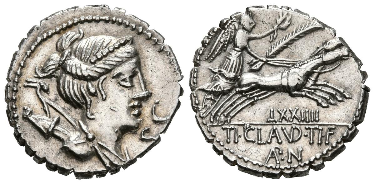 GENS CLAUDIA. Denario. (Ar. 3,83g/18mm). 79 a.C. Taller auxiliar de Roma. (FFC 567; Crawford 381/1a). Anv: Busto diademado de Diana a derecha con arco y carcaj, delante: SC. Rev: Victoria con corona de laureal y palma en biga a derecha, debajo: XXIII, en exergo: TI CLAVD TI F AP N. EBC. Precioso ejemplar.