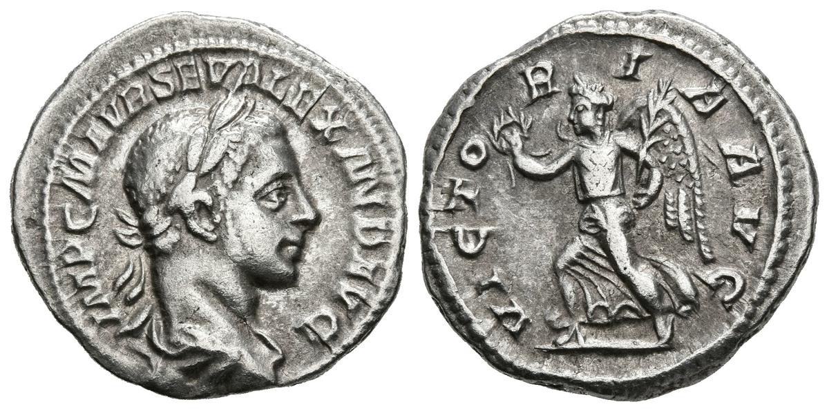 ALEJANDRO SEVERO. Denario. (Ar. 3,47g/20mm). 225 d.C. Roma. (RIC 180). Anv: Busto laureado y drapeado de Alejandro Severo a derecha, alrededor leyenda: IMP C M AVR SEV ALEXAND AVG. Rev: Victoria avanzando a izquierda portando corona de laurel y palma, alrededor leyenda: VICTORIA AVG. MBC.