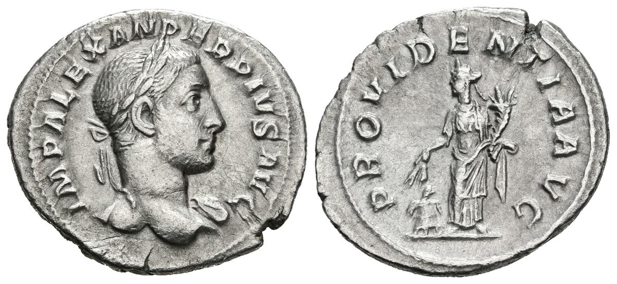 ALEJANDRO SEVERO. Denario. (Ar. 1,98g/21mm). 231-235 d.C. Roma. (RIC 250). Anv: Busto laureado de Alejandro Severo a derecha con ligero drapeado en hombro izquierdo, alrededor leyenda: IMP ALEXANDER PIVS AVG. Rev: Providentia estante a izquierda sosteniendo espigas sobre modio y cornucopia, alrededor leyenda: PROVIDENTIA AVG. MBC+.