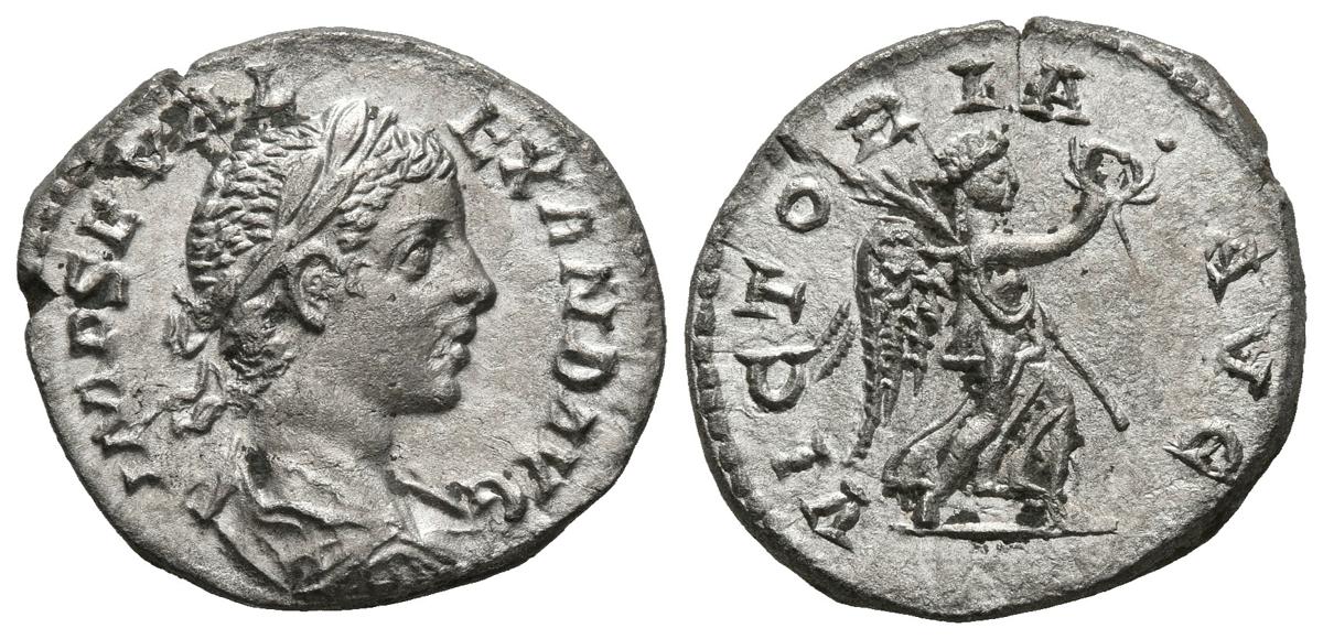 ALEJANDRO SEVERO. Denario. (Ar. 2,68g/19mm). 222 d.C. Antioquía. (RIC 302). Anv: Busto laureado y drapeado de Alejandro Severo a derecha, alrededor leyenda: IMP SEV ALEXAND AVG. Rev: Victoria avanzando a derecha portando corona de laurel, alrededor leyenda: VICTORIA AVG. EBC-.