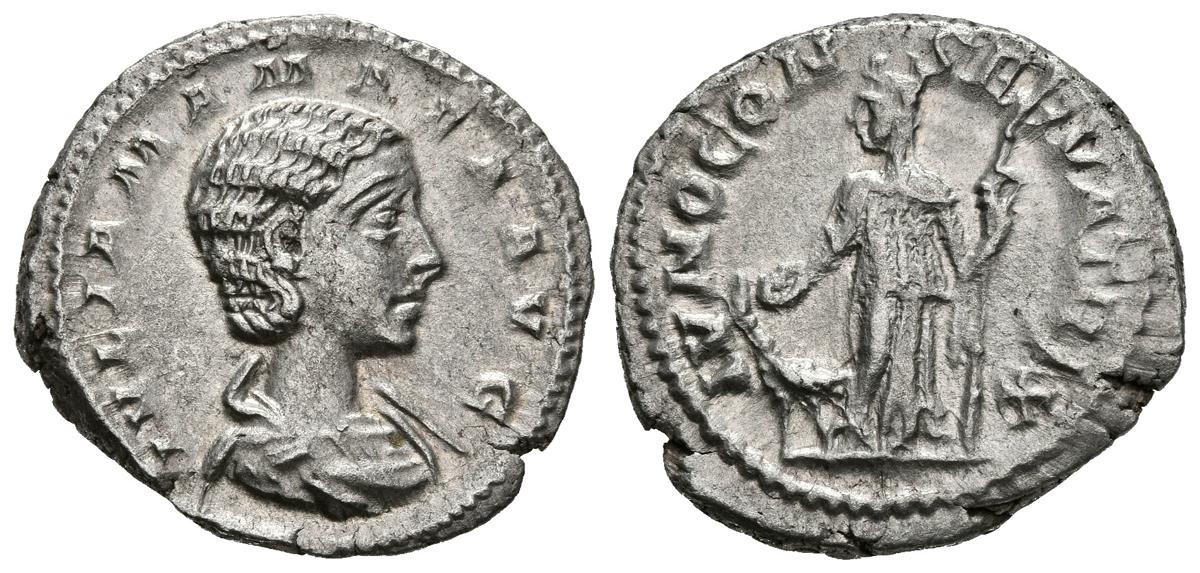 JULIA MAMAEA. Denario. (Ar. 3,27g/20mm). 222 d.C. Roma. (RIC 343). Anv: Busto drapeado de Julia Mamaea a derecha, alrededor leyenda: IVLIA MAMAEA AVG. Rev: Juno estante a izquierda portando patera y cetro, a sus pies pavo real, alrededor leyenda: IVNO CONSERVATRIX. EBC-. Bonito ejemplar.