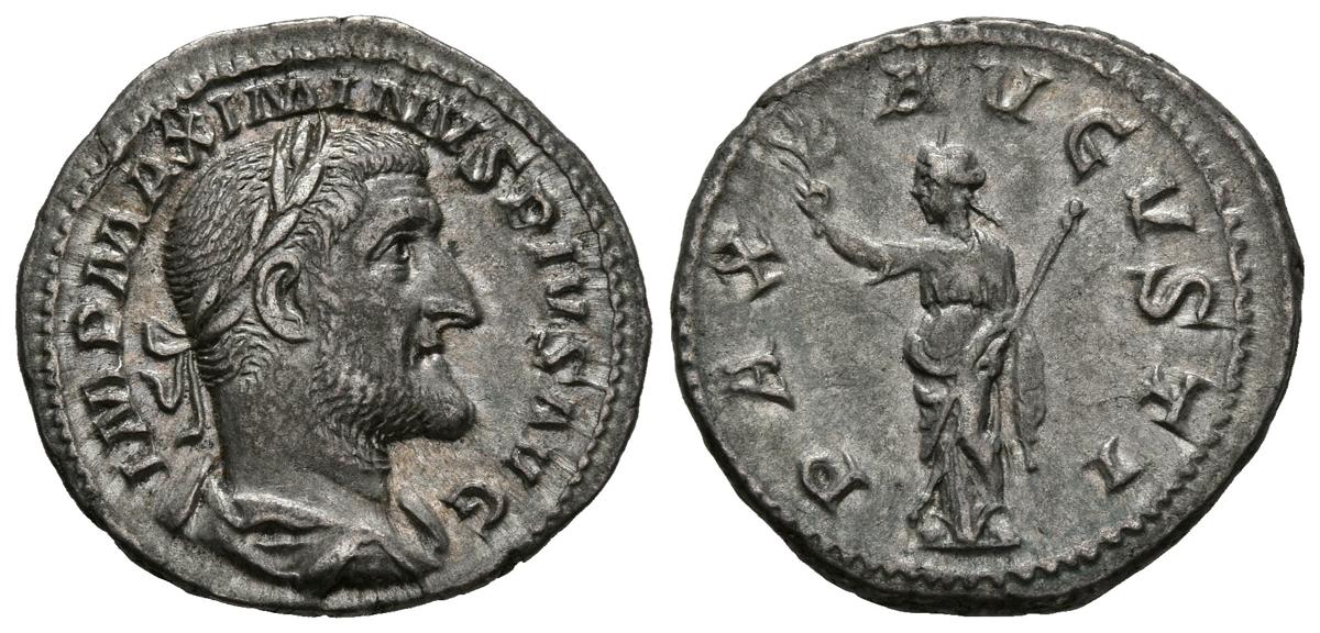 MAXIMINO I. Denario. (Ar. 3,22g/20mm). 235 d.C. Roma. (RIC 12). Anv: Busto laureado y drapeado de Maximino I a derecha, alrededor leyenda: IMP MAXIMINVS PIVS AVG. Rev: Pax estante a izquierda portando rama y cetro, alrededor leyenda: PAX AVGVSTI. EBC-.