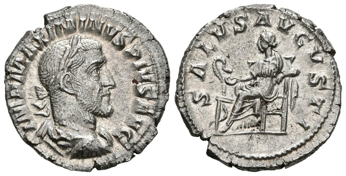 MAXIMINO I. Denario. (Ar. 3,13g/19mm). 236 d.C. Roma. (RIC 14). Anv: Busto laureado y drapeado de Maximino I a derecha, alrededor leyenda: IMP MAXIMINVS PIVS AVG. Rev: Salus sentada a izquierda alimentando serpiente de patera, alrededor leyenda: SALVS AVGVSTI. EBC-. Bonito ejemplar.
