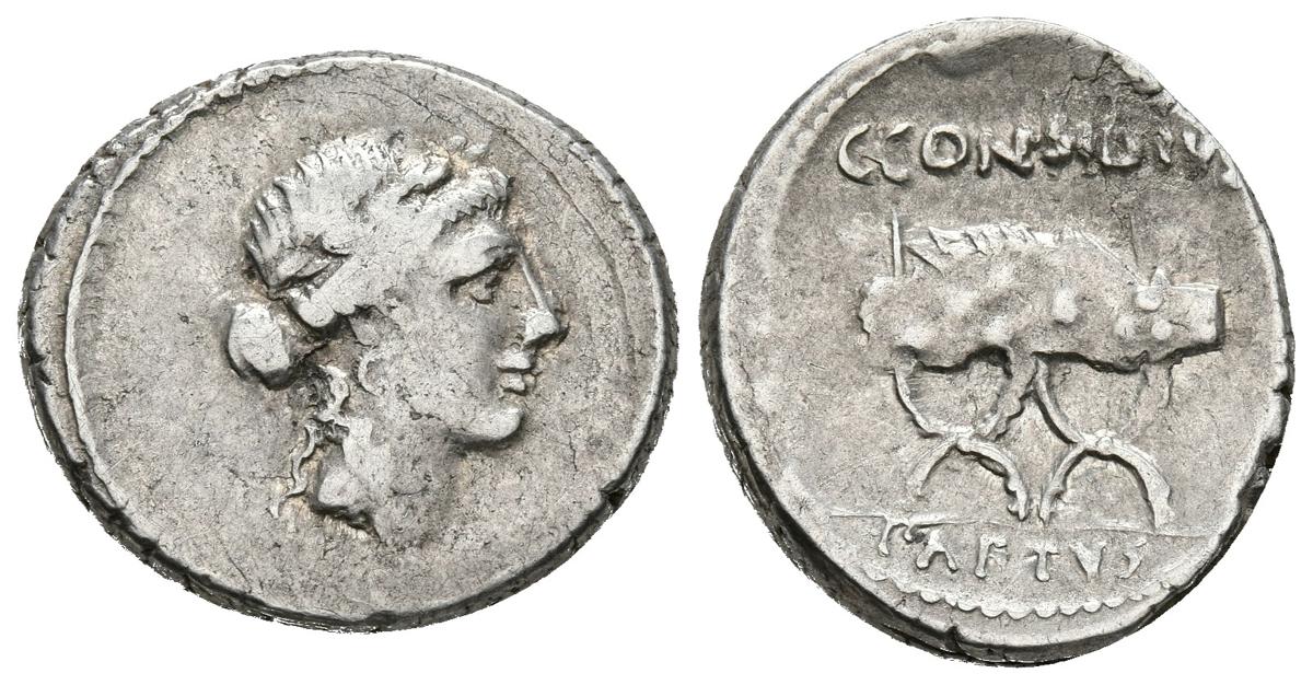 GENS CONSIDIA. Denario. (Ar. 3,95g/18mm). 46 a.C. Roma. (FFC 592; Crawford 415/1b). Anv: Cabeza laureada de Apolo a derecha dentro de orla de puntos. Rev: Corona de laurel sobre silla curul, encima leyenda: C CONSIDIVS, debajo leyenda: PAETVS. MBC.