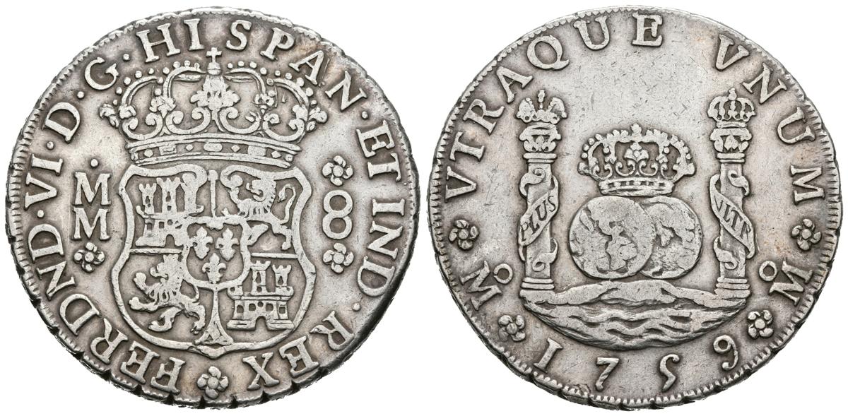 FERNANDO VI ( 1746-1759). 8 Reales. (Ar. 26,89g/39mm). 1759. México. MM. (Cal-2019-495). Corona real e imperial sobre columnas. MBC+