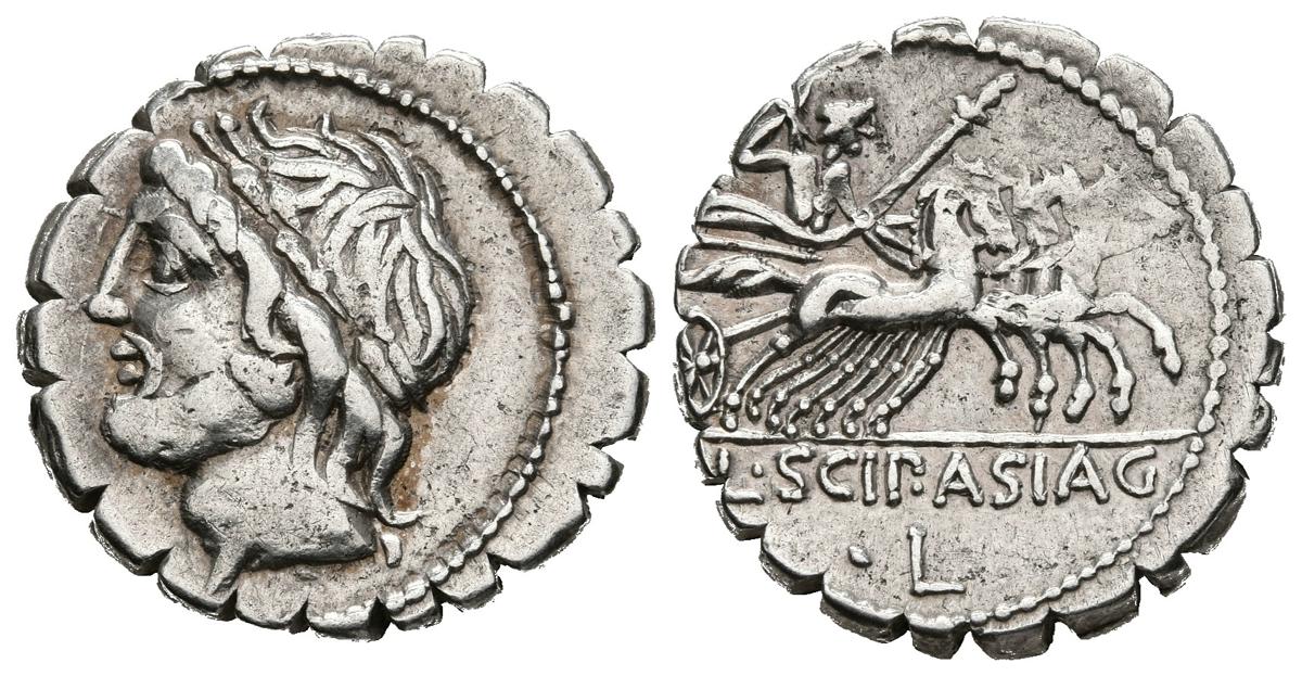 GENS CORNELIA. Denario. (Ar. 3,99g/18mm). 106 a.C. Roma. (FFC 613; Crawford 311/1b). Anv: Cabeza laureada de Júpiter a izquierda. Rev: Júpiter en cuádriga a derecha con cetro y rayo, en exergo: L SCIP ASIAG, debajo letra: L. MBC.