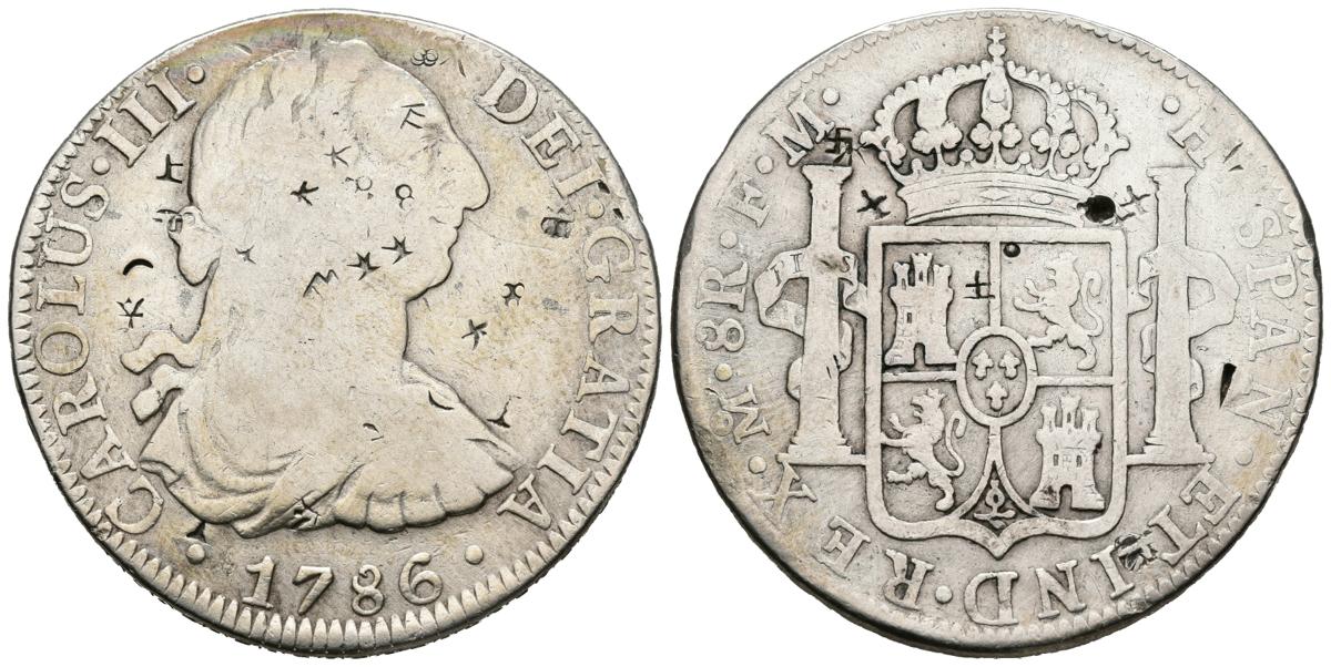CARLOS III (1759-1788). 8 Reales. (Ar. 26,43/39mm). 1786. México. FM. (Cal-2019-1129). BC. Resellos orientales.