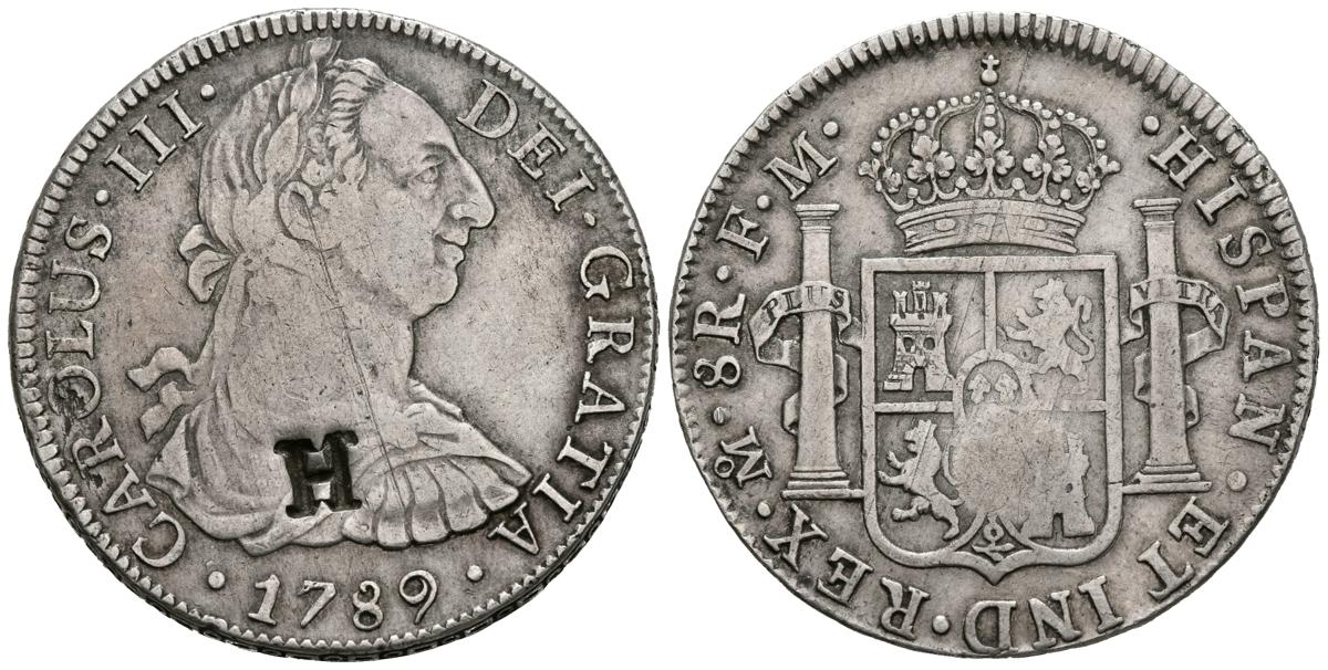 CARLOS III (1759-1788). 8 Reales. (Ar. 26,87/39mm). 1789. México. FM. (Cal-2019-1134). Resello H en anverso. MBC. Rayas de ajuste.