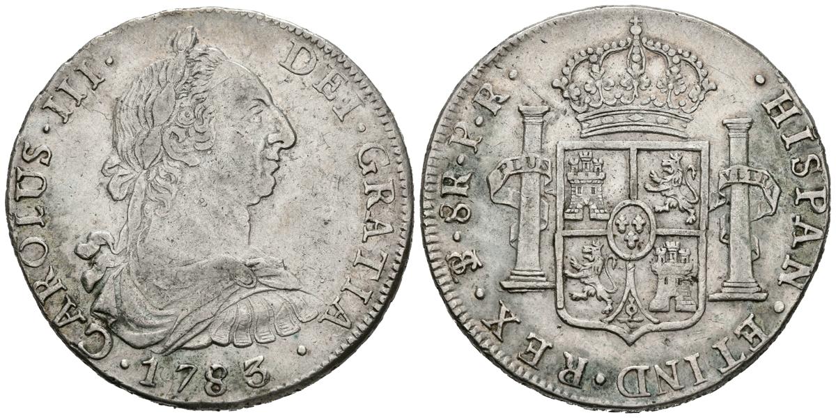 CARLOS III (1759-1788). 8 Reales. (Ar. 26,98g/40mm). 1783. Potosí PR. (Cal-2019-1186). MBC+. Ligera oxidación limpiada.