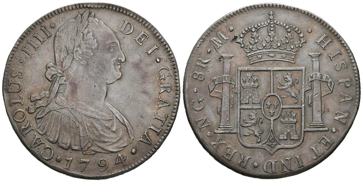 CARLOS IV (1788-1808). 8 Reales. (Ar. 26,75g/39mm). 1794. Guatemala. M. (Cal-2019-884). EBC-. Pequeñas marquitas en reverso. Magnífica pátina irisada. Precioso ejemplar.