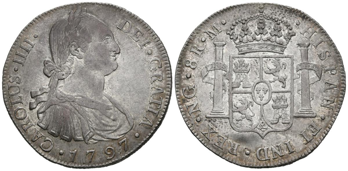CARLOS IV (1788-1808). 8 Reales. (Ar. 26,91/39mm). 1797. Guatemala. M. (Cal-2019-890). EBC-. Restos de brillo original. Pátina irisada.