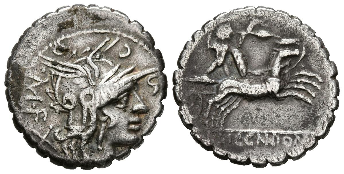 GENS COSCONIA. Denario. (Ar. 3,84g/19mm). 118 a.C. Narbo. (FFC 652; Crawford 282/2). Anv: Cabeza de Roma a derecha, detrás X, alrededor leyenda: L COSCO M F. Rev: El guerrero galo Bituitus en biga a derecha con escudo y arrojando jabalina, en exergo: L LIC CN DOM. MBC.
