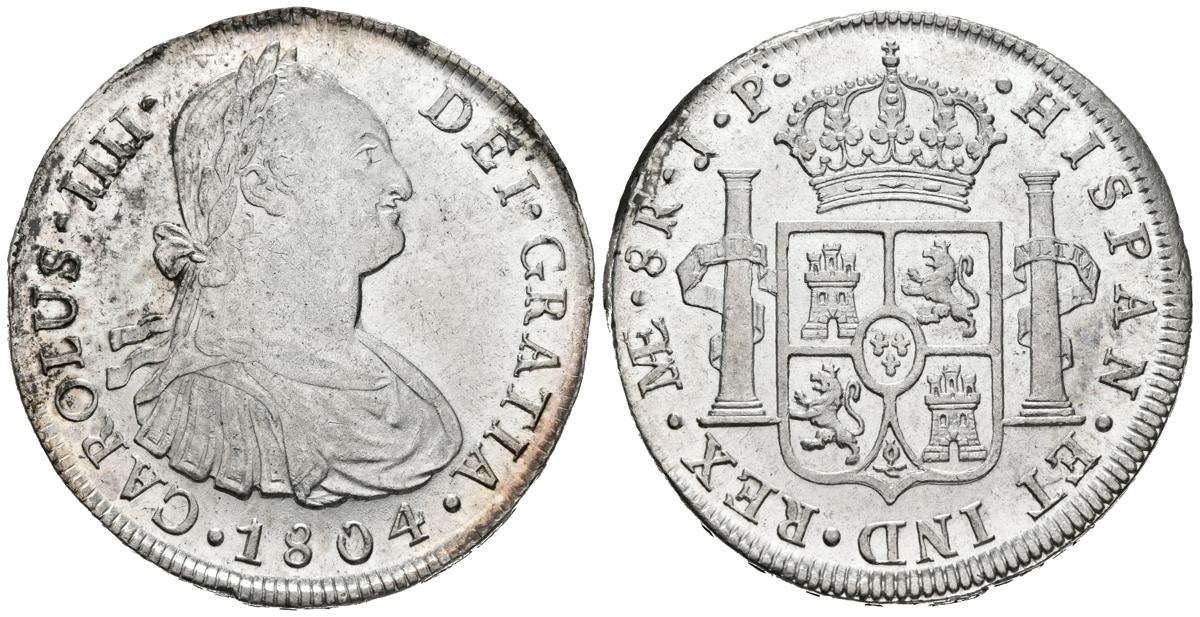 CARLOS IV (1788-1808). 8 Reales. (Ar. 27,43/40mm). 1804. Lima. JP. (Cal-2019-924). EBC+. Brillo original. Precioso ejemplar, escaso así.