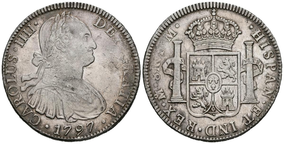 CARLOS IV (1788-1808). 8 Reales. (Ar. 26,97/40mm). 1797. México. FM. (Cal-2019-960). MBC+. Marcas en anverso. Raya en el cuello.