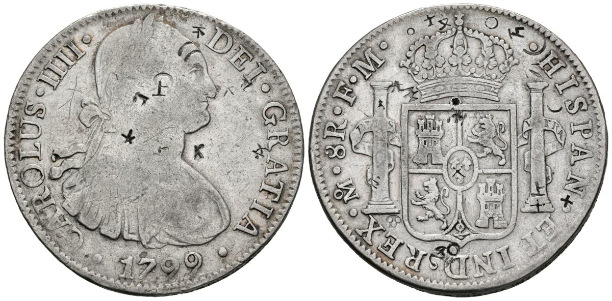 CARLOS IV (1788-1808). 8 Reales. (Ar. 26,65/39mm). 1799. México. FM. (Cal-2019-963). BC+. Resellos orientales.