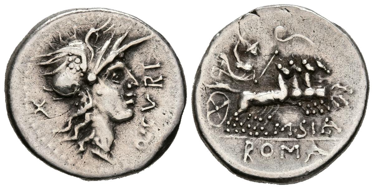 GENS CURTIA. Denario. (Ar. 3,80g/20mm). 116-115 a.C. Norte de Italia. (FFC 670; Crawford 285/2). Anv: Cabeza de Roma a derecha, detrás X, delante leyenda: Q CVRT. Rev: Júpiter con cetro y haz de rayos en cuádriga a derecha, encima lítuo, debajo leyenda: M SILA, en exergo: ROMA. MBC.