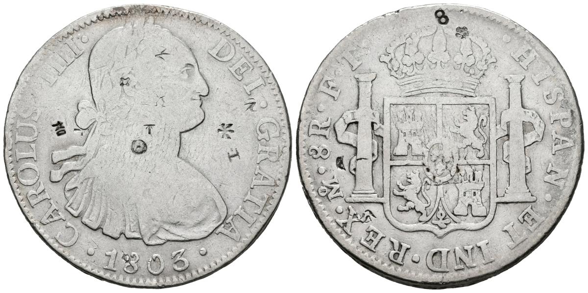 CARLOS IV (1788-1808). 8 Reales. (Ar. 26,46/39mm). 1803. México. FT. (Cal-2019-977). BC. Resellos orientales.