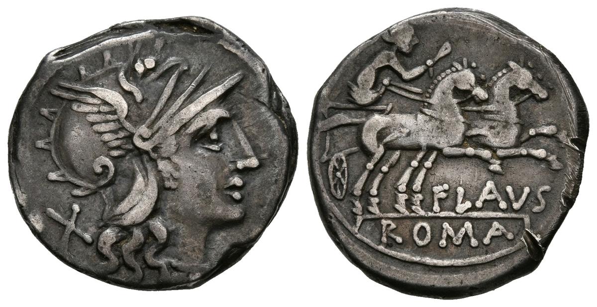 GENS DECIMIA. Denario. (Ar. 3,45g/18mm). 150 a.C. Roma. (FFC 673; Crawford 207/1). Anv: Cabeza de Roma a derecha, detrás X. Rev: Diana con látigo en biga a derecha, debajo leyenda: FLAVS, en exergo: ROMA. MBC.