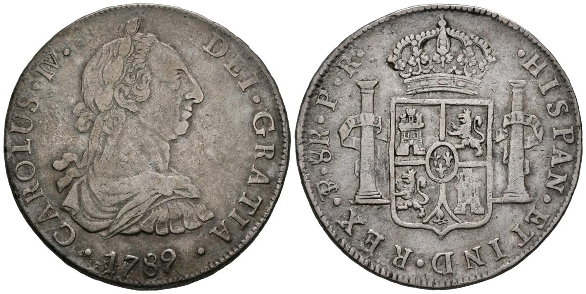 CARLOS IV (1788-1808). 8 Reales. (Ar. 26,95/41mm). 1789. Potosí. PR. (Cal-2019-989). Busto de Carlos III. Ordinal IV. MBC. Primer año de acuñación.