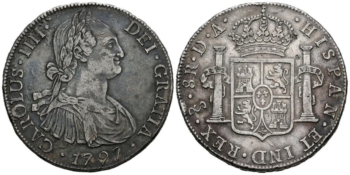 CARLOS IV (1788-1808). 8 Reales. (Ar. 26,73/40mm). 1797. Santiago. DA. (Cal-2019-1029). MBC+. Bonita pátina irisada en anverso. Raro.