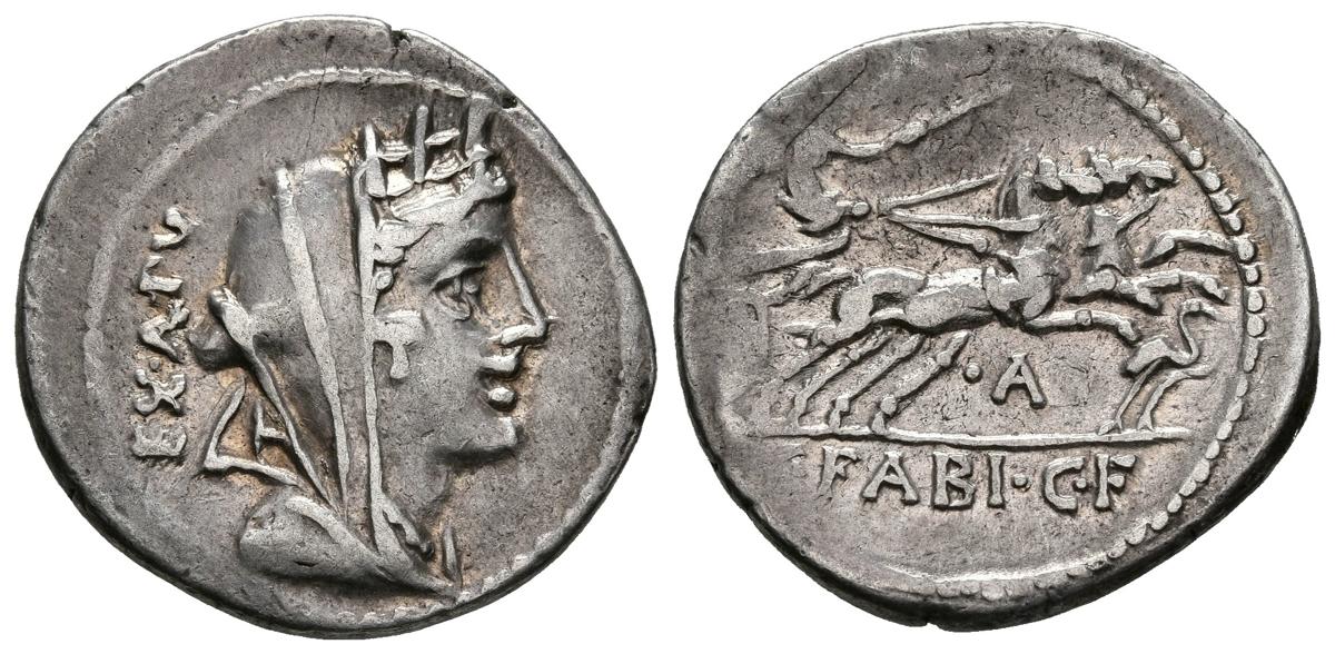 GENS FABIA. Denario. (Ar. 3,90g/21mm). 104 a.C. Roma. (FFC 703; Crawford 322/1b). Anv: Cabeza de Cibeles velada y con corona mural a derecha, detrás leyenda: EX A PV. Rev: Victoria con látigo en biga a derecha, delante sobre el exergo cigüeña, debajo de los caballo letra: A, en exergo: C FABI CF. MBC.