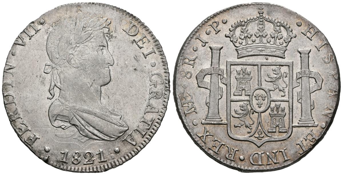 FERNANDO VII (1808-1833). 8 Reales. (Ar. 26,54g/38mm). 1821. Lima. JP. (Cal-2019-1254). Busto laureado. EBC. Rayitas de limpieza. Acuñada sobre otra moneda.