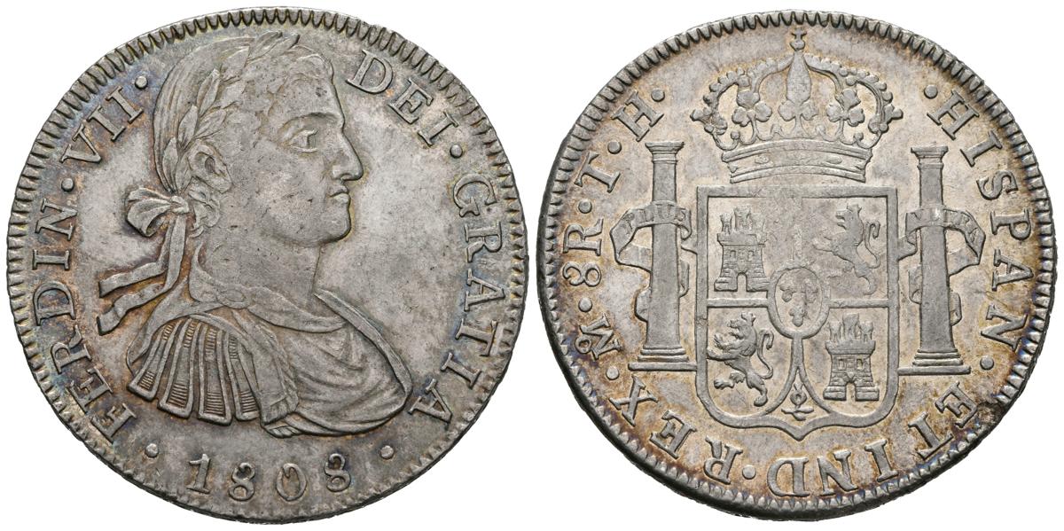 FERNANDO VII (1808-1833). 8 Reales. (Ar. 26,92g/40mm). 1808. México. TH. (Cal-2019-1306). Busto imaginario. MBC+. Hojita en reverso. Precioso tono irisado.Entre 1808 y 1811 se emitieron monedas en diferentes cecas americanas con el llamado busto imaginario. De entre todas estas acuñaciones, quizás la más popular y conocida sea la acuñada en México. La premura de contar para el día de la proclamación con las nuevas acuñaciones que reflejaran el rostro de Fernando VII y ante la insistencia del Virrey Iturrigaray de dar cumplimiento a lo exigido por la Junta Suprema de Sevilla, no quedó otro camino que crear de la nada o bien tomando como referencia alguna estampa de la época, un rostro para estas acuñaciones. El busto de Fernando VII de México siguió fielmente en cuanto a estética el modelo de Carlos IV, si bien se modificó la cara para borrar el parecido con su padre. Se le atribuye a Fernando Gordillo la autoría del cuño del nuevo retrato.