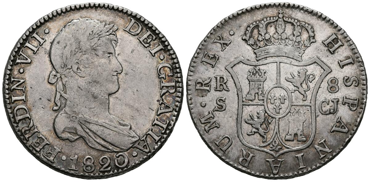 FERNANDO VII (1808-1833). 8 Reales. (Ar. 26,92g/38mm). 1820. Sevilla. CJ. (Cal-2019-1421). Busto laureado. MBC. Escasa.
